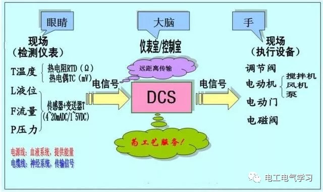 就如下圖所示,DCS相當于大腦,對眼睛看到的情況(即現場檢測儀表傳輸過來的信號,如水位降低)做出反應(即發出指令,如增大進水閥開度),現場執行設備接受到指令做出相應的動作(如增大進水閥門開度,保持水位在一定范圍)。